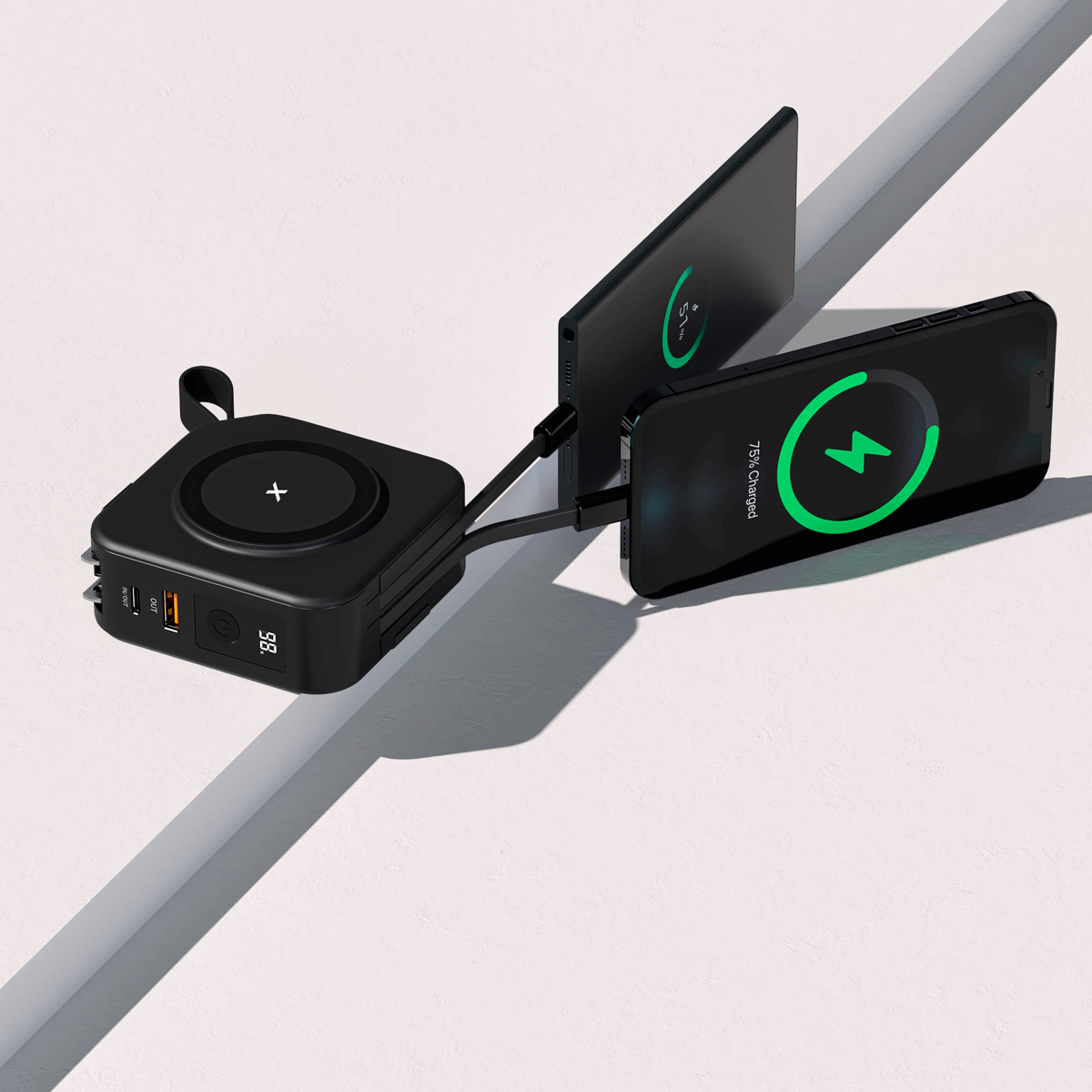 Nuestro Travel Charger tiene cables Lightning y USB-C integrados que admiten carga rápida. No más cables desordenados y enredados y nunca te preocupes por dejarlos atrás.