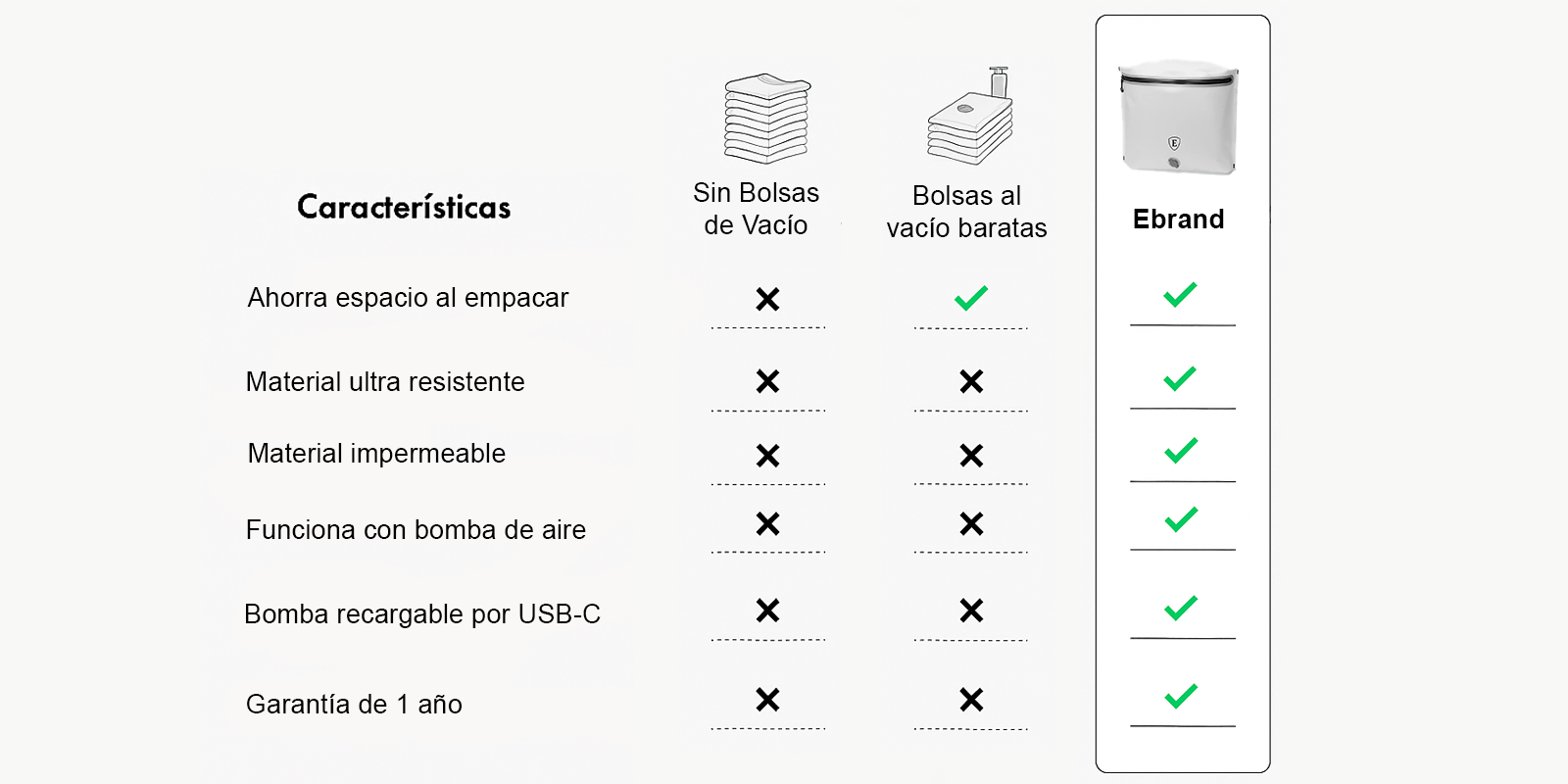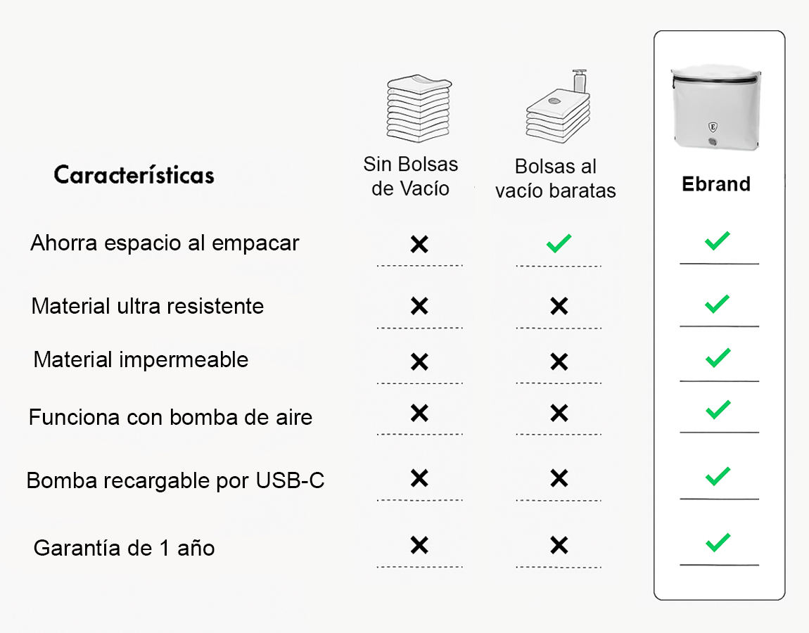 - Empaca un 50 % más con la bolsa de compresión