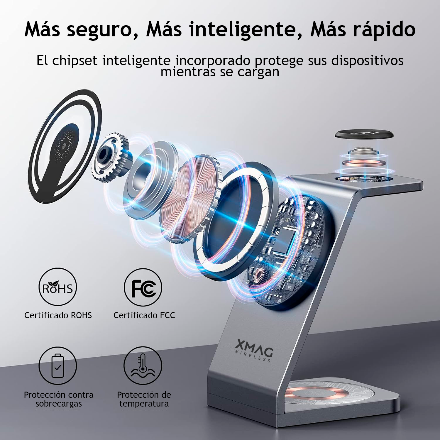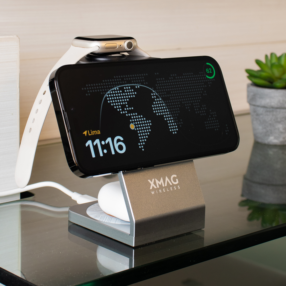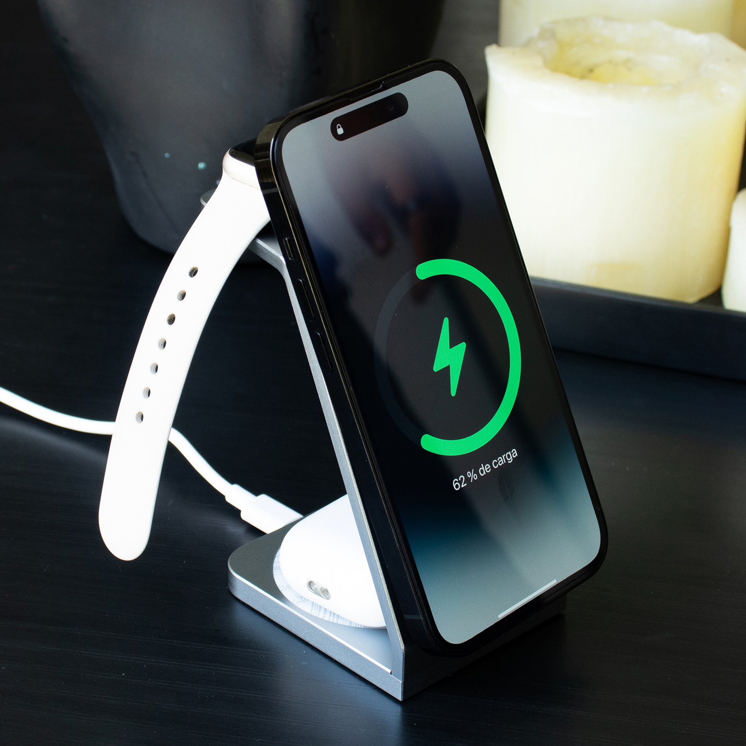 Di adiós a los cables desordenados y da la bienvenida a un espacio más limpio y organizado. El Power Base te permite cargar hasta tres dispositivos simultáneamente: tu teléfono inteligente, Apple Watch y AirPods.